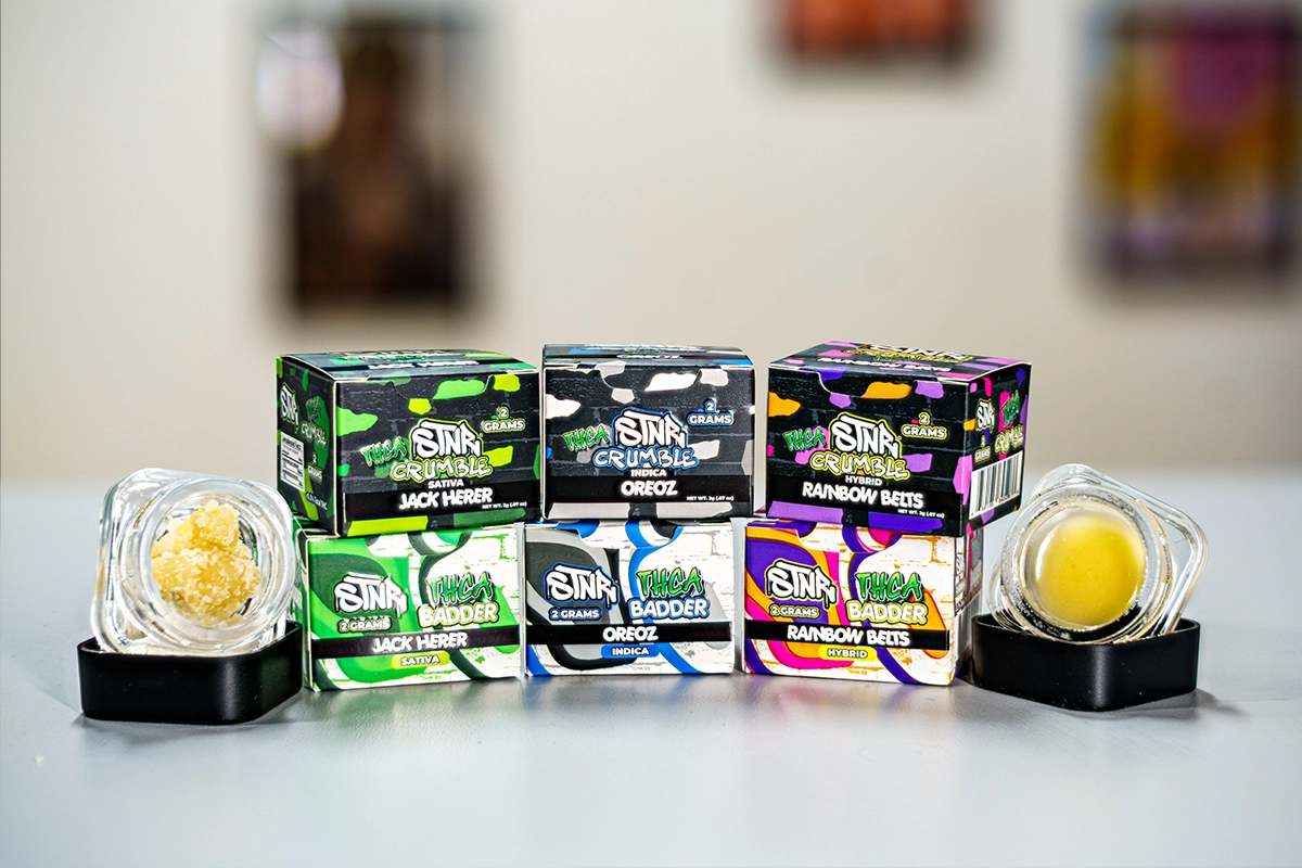 STNR’s upgraded 2-gram Badder and Crumble concentrates are here—now crafted with a smoother, cleaner formula and available in three bold new flavors: Rainbow Belts, Oreoz, and Jack Herer. Whether you’re into the creamy, easy-to-dab texture of badder or the crisp, flaky feel of crumble, you’ll get top-tier potency and terpene-rich flavor in every hit. Each batch is made from high-quality hemp-derived THCA and rigorously third-party tested, so you can enjoy with total confidence. Elevate your sesh with concentrates that deliver next-level flavor, strength, and consistency.